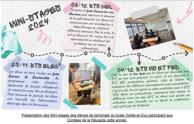 Sont appelées “mini-stages” les journées de découverte des quatre BTS qui constituent la cordée. Cela se passe sur une journée, où les élèves se déplacent dans les établissements. Le but est de leur faire découvrir le contenu et les attentes du BTS concerné ainsi que le cadre dans lequel ils pourraient évoluer s’ils venaient à rejoindre le lycée visité. C’est également l’occasion de rencontrer les professeurs et de discuter avec les étudiants afin d’avoir un retour d’expérience concret.